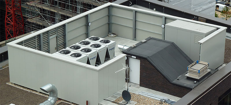 The primary use of SPS/V panels is as a very adaptable acoustic barrier around plant areas. SPS/V panels are supplied with clip joints for the long sides, and are designed for vertical installation with support steelwork. Roof top screens are normally attached to existing structures – details vary accordingly. Where mechanical fixing into structural elements is not possible, screens can be provided with a free standing frame arrangement. The frames incorporate concrete paving ballast to suit site conditions, wind loadings etc.