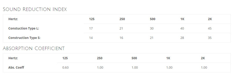 Indicative acoustic performance is shown below. In practice the level of performance achieved is influenced by the position and size of the screen in relation to the sound source and to the measurement point.